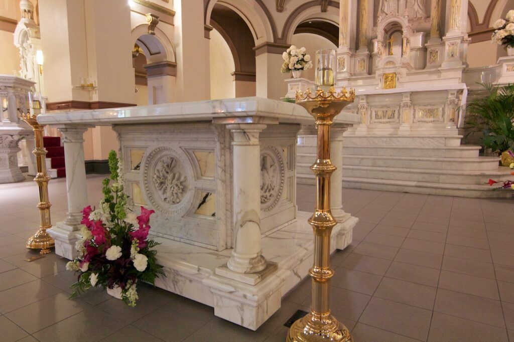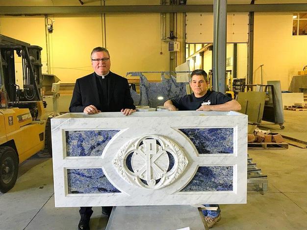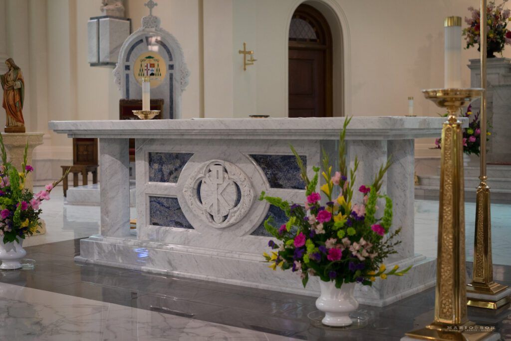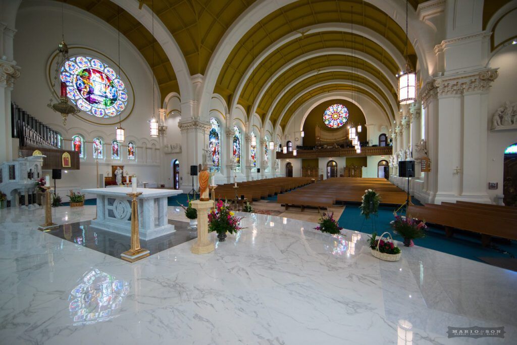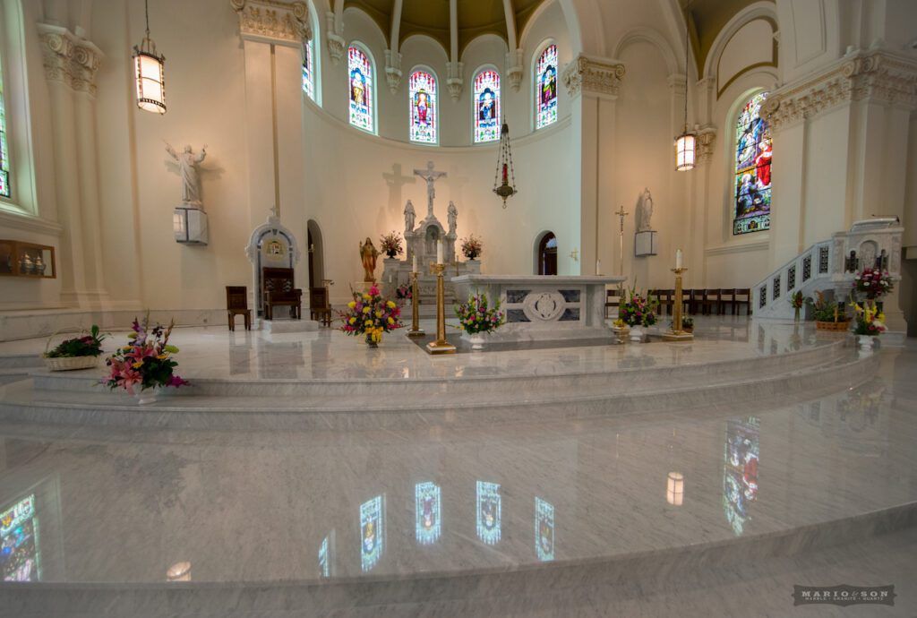 The one thing that instantly grabs your attention in the cathedral are the exquisite stained-glass windows, the colors of which rival anything I’ve seen in Europe. It was this beautiful display of vivid color that drove the design of the new altar. The jewel-like blue tones of Azul Bahia granite added just the right amount of accent to be effective, and Father Connell appreciated the blue color correlation with the Blessed Virgin Mary.