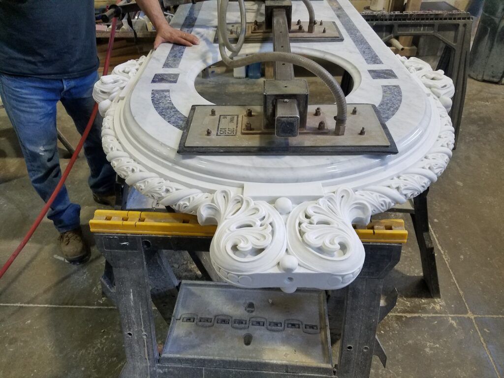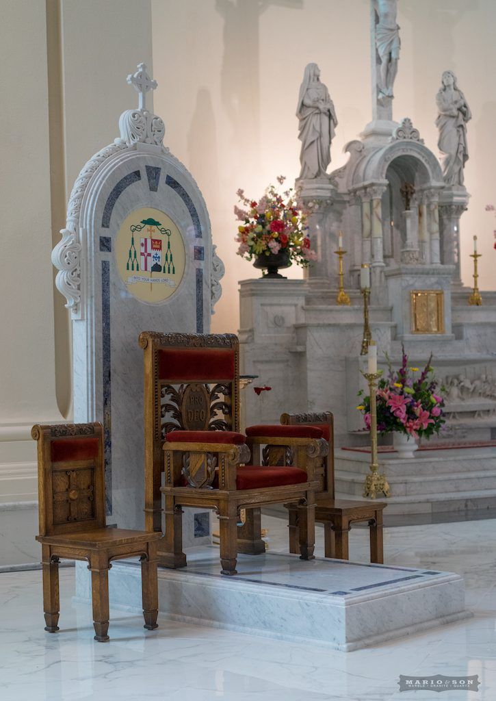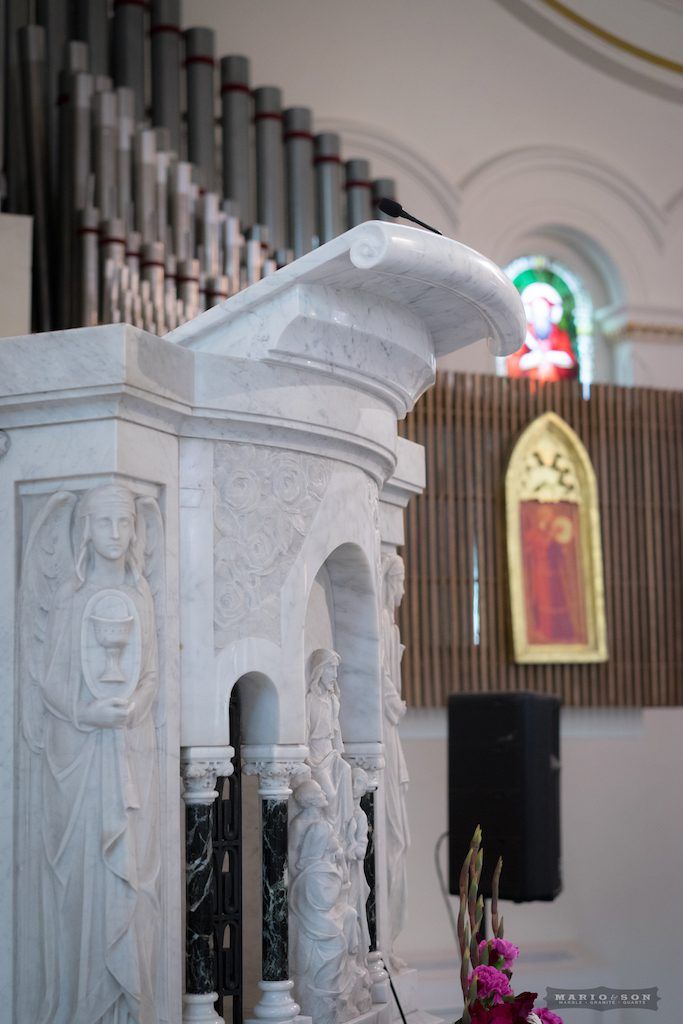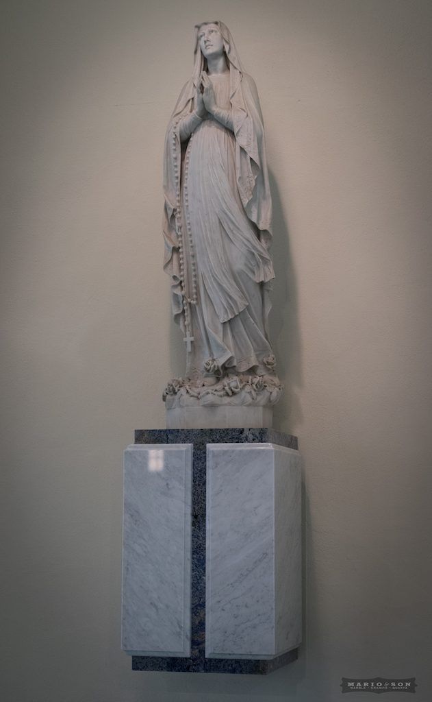 The Bishop’s chair platform soon followed, as a companion piece to the altar, along with new elevated bases for the existing statues of Jesus and Mary completing the ensemble. On Mary’s platform, I set the Carrara marble veining in a “V” pattern, representing the chalice, or femininity. The devil is in the details, even though that’s not the best analogy for this subject.