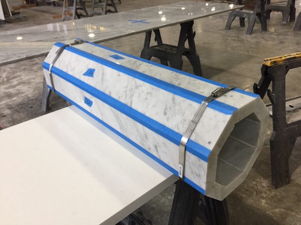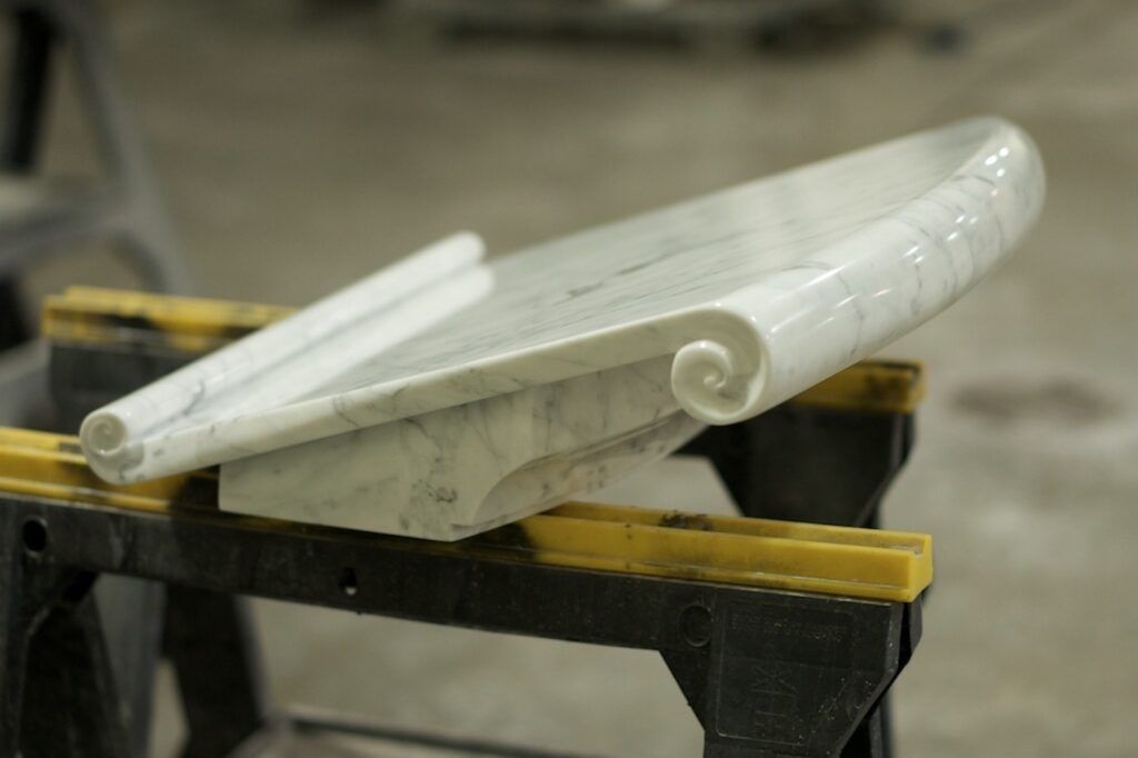 The last phase was a series of radius stairs leading to the altar. Twenty two slabs worth of Carrara marble, with the middle landing section being as large as the slabs would allow, about a half ton each in this case.